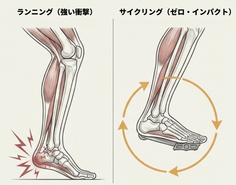 ランニングのような衝撃の強い運動では、膝や足首への負担が問題になることがある。